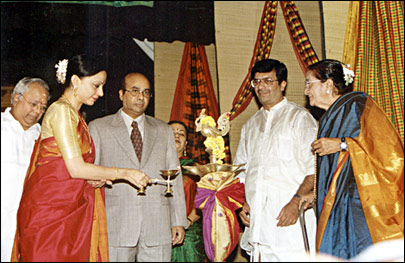 The decor on stage was eye-catching at Bharat Kalachar. Dr. Y G Parthasarathy (seen on extreme right) brought out her best vintage saris and decorated the flanks with them. The season is also the time when artistes as well as rasikas are seen with their best saris. Very evident at the traditional inauguration as dancer Malavika Sarukkai light the lamp with other dignitaries around. |