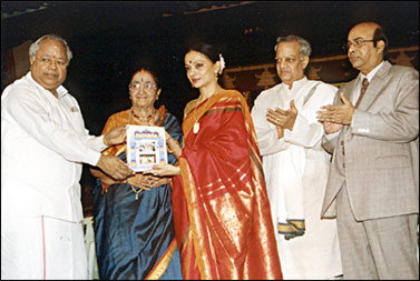 A souvenir was released on this occasion. Businessman and arts promoter 'Nalli' Kuppuswamy receives a copy from dancer Malavikka Sarukkai. Seen with them are Dr. Y G Parthasarathy who heads this sabha, guests N. Gopalaswami, Home Secretary, Govt. of India, and Justice Subhashan Reddy, Chief Justice of Madras High Court. |