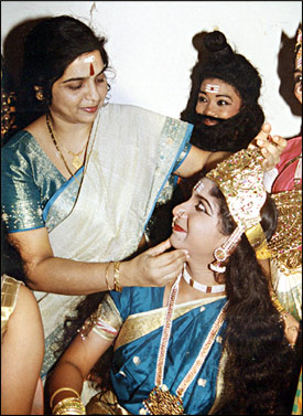 And finally, when film and drama artiste Y Gee Mahendra, who is also the Cultural consultant to Bharat Kalachar, said thank you to guests, on the Day of the Awards, it was time for a dance ballet - 'Mahadevam Mahasenam Bhaje' produced and directed by Anitha Guha. Here, Anitha who has come in for a lot of praise for her work with children, checks if all is well in the green room! |
