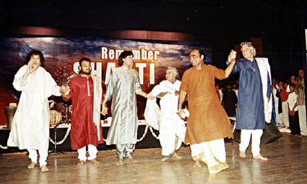 Time to take the bow and the cheers at The Music Academy; the Shakti band is joined by guest artistes Vikku Vinayakram and Palanivel.